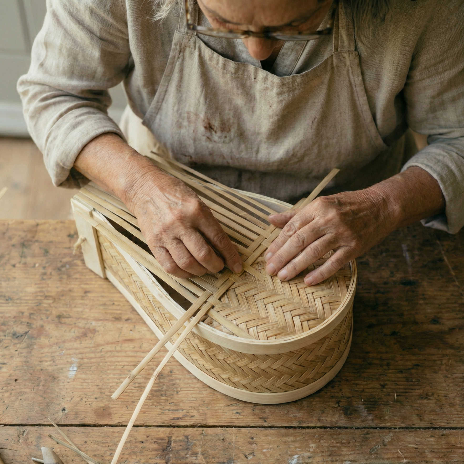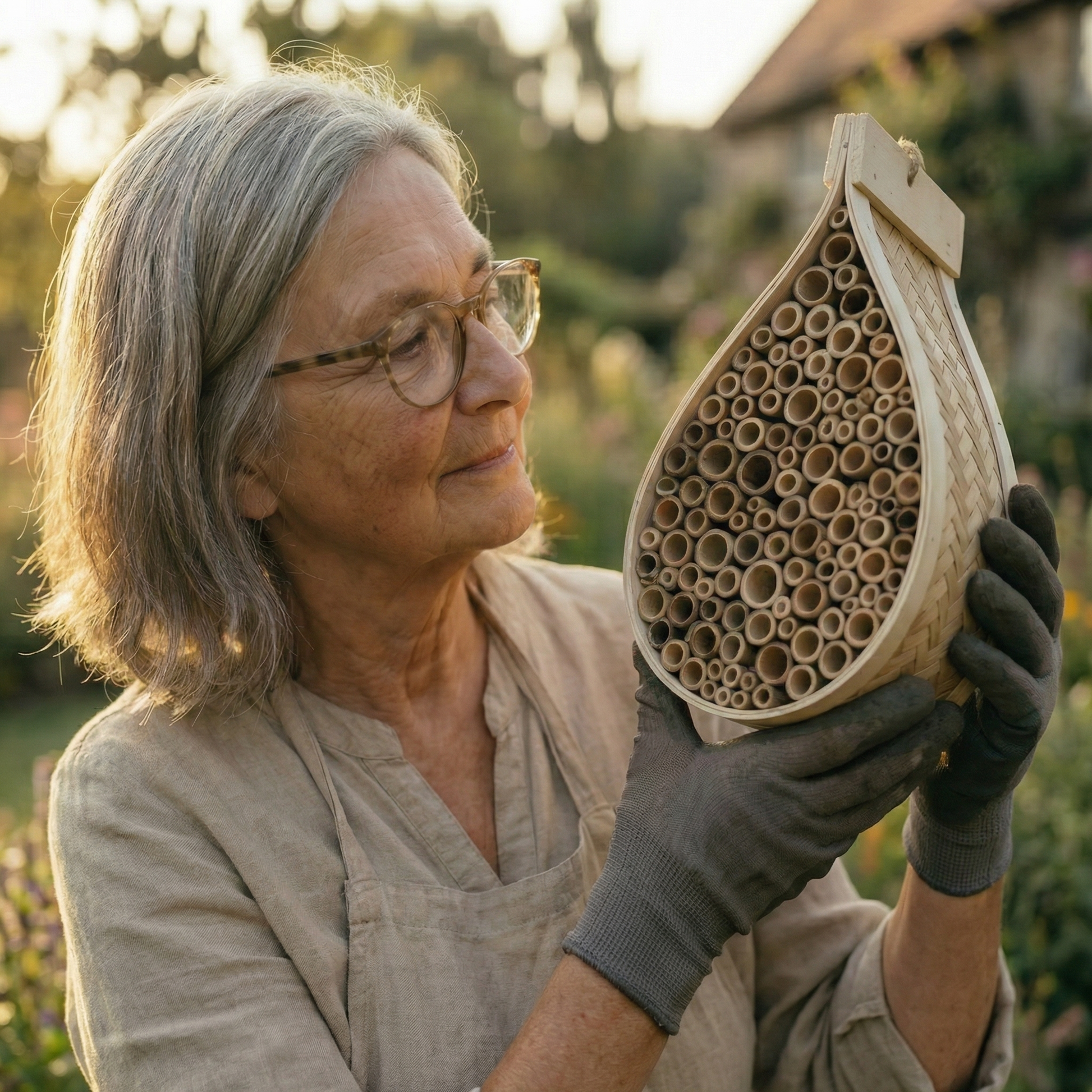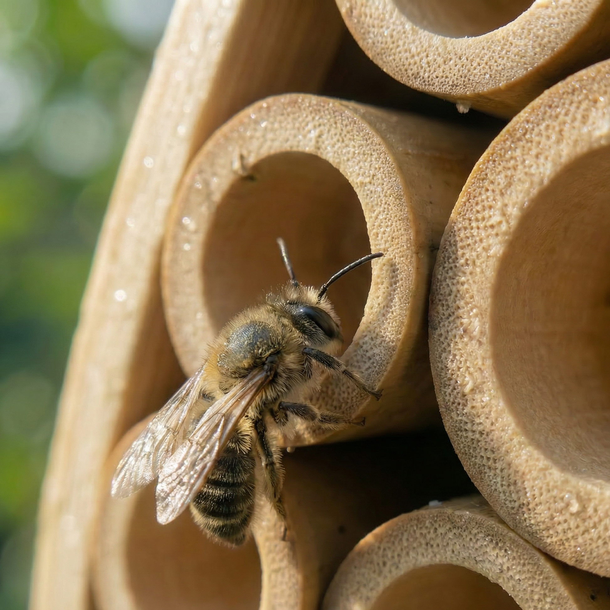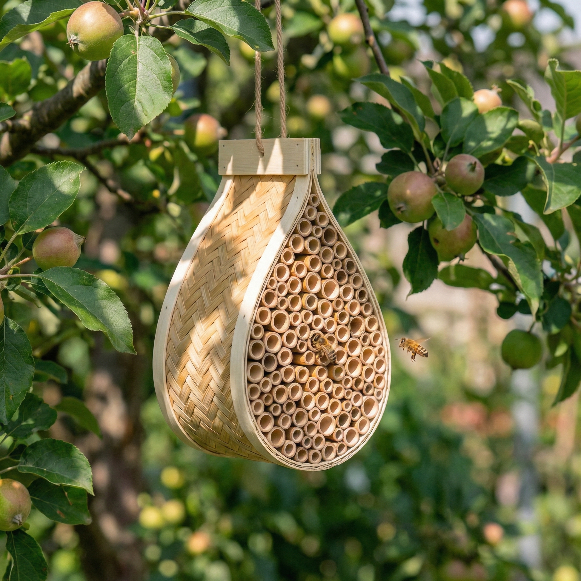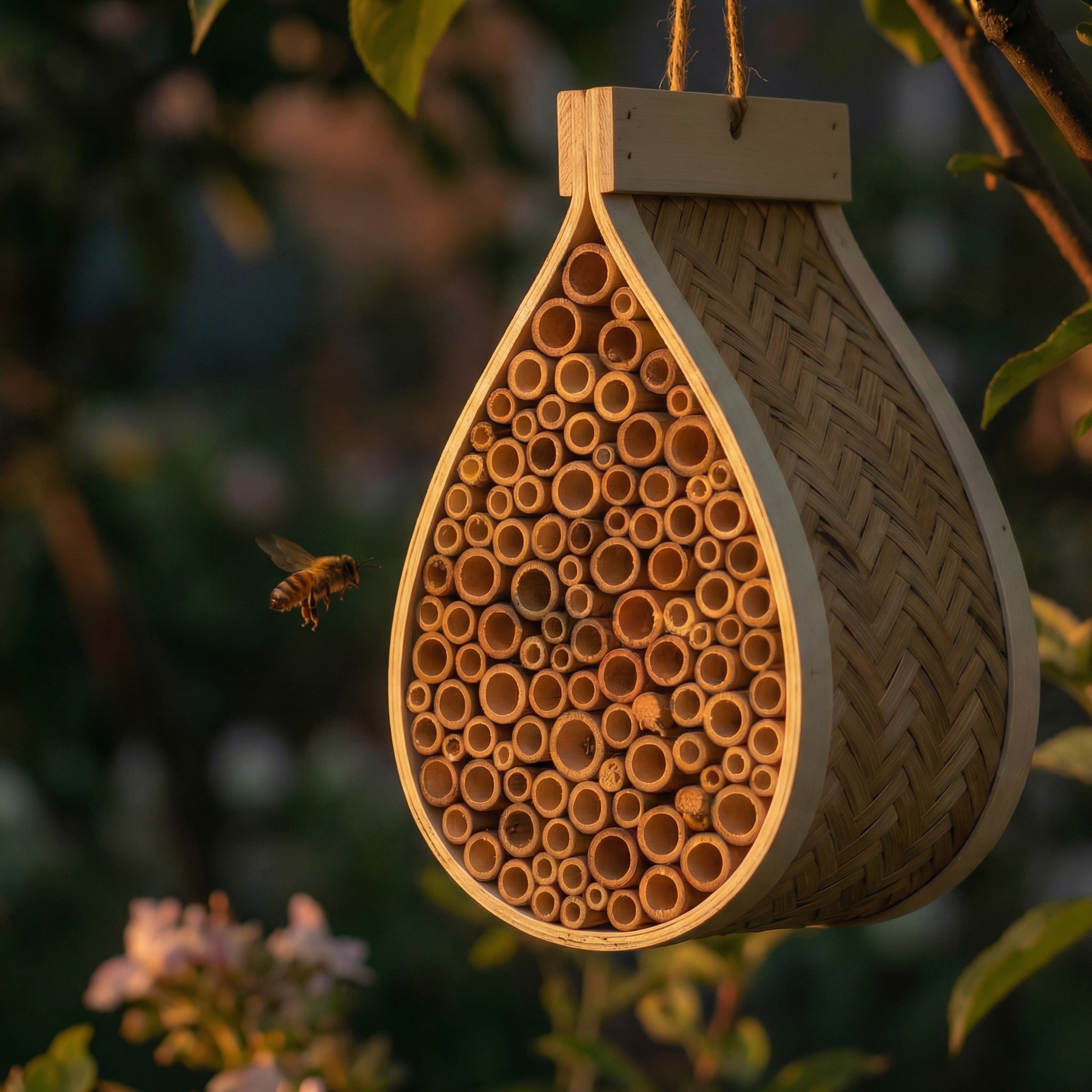 Jedes âGartenretter" Bienenhotel entsteht in Handarbeit. Der Holzkern wird aus witterungsbestĂ€ndigem Naturholz in die charakteristische Wassertropfenform geschnitten. Danach werden die Bambus-Niströhren einzeln eingesetzt â jede Kammer fĂŒr sich, ohne Verbindung zur nĂ€chsten. AbschlieĂend wird die Ă€uĂere Bambus-HĂŒlle StrĂ€hne fĂŒr StrĂ€hne von Hand um den Kern geflochten. Kein Kleber, keine Maschine. Das AufhĂ€ngetau wird von Hand befestigt, das fertige Haus einmal geprĂŒft â dann geht es ins Regal. Jedes StĂŒck ist ein Unikat.