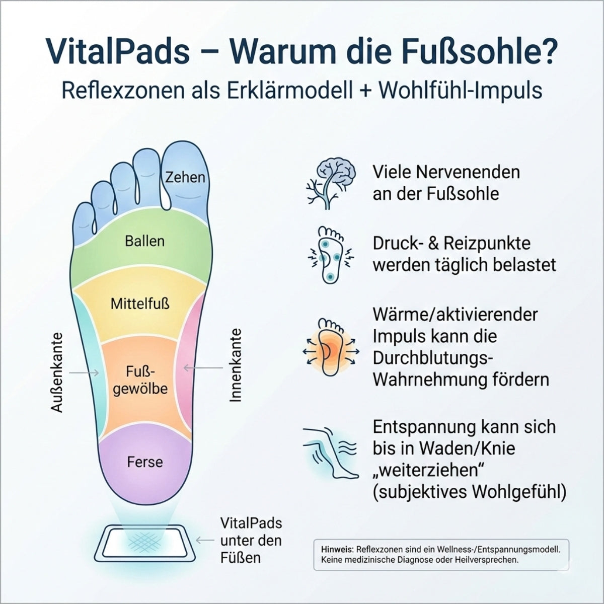 VitalPads wurden dafür entwickelt, diese Zone dort zu unterstützen, wo es am meisten zählt: direkt an den Fußsohlen – dem Bereich, der den ganzen Tag Ihr Körpergewicht trägt und dabei oft zu wenig Aufmerksamkeit bekommt.
